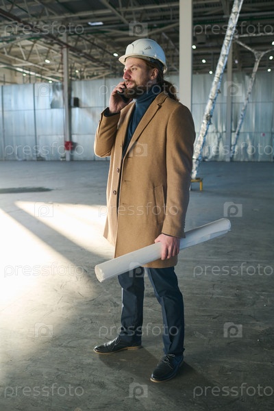 Боковой вид молодого бородатого инженера в повседневной одежде и защитном шлеме