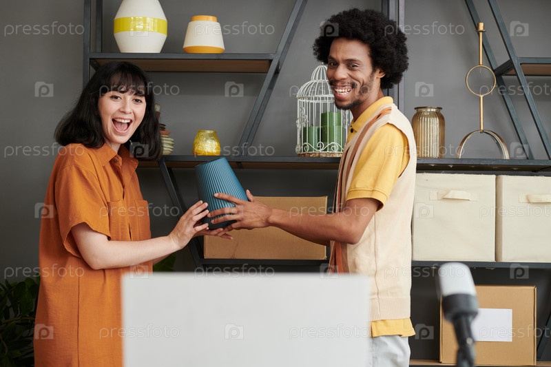 Молодая веселая межкультурная пара показывает вазу из новой коллекции