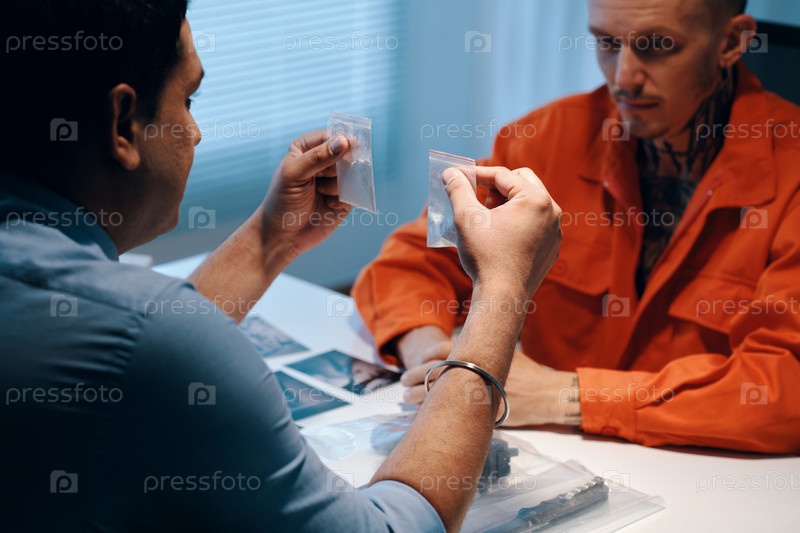 Полицейский показывает сумки с белым порошком