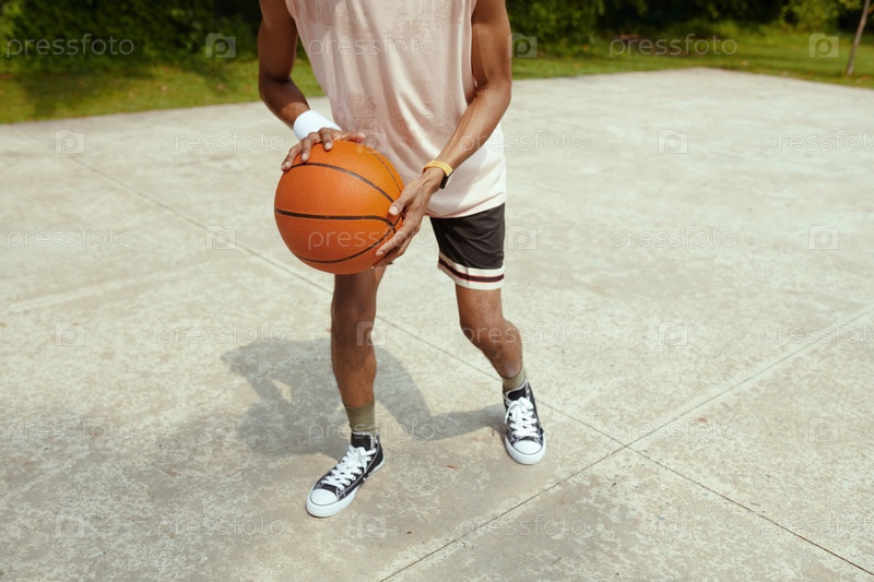Потный спортсмен, играющий в стритбол
