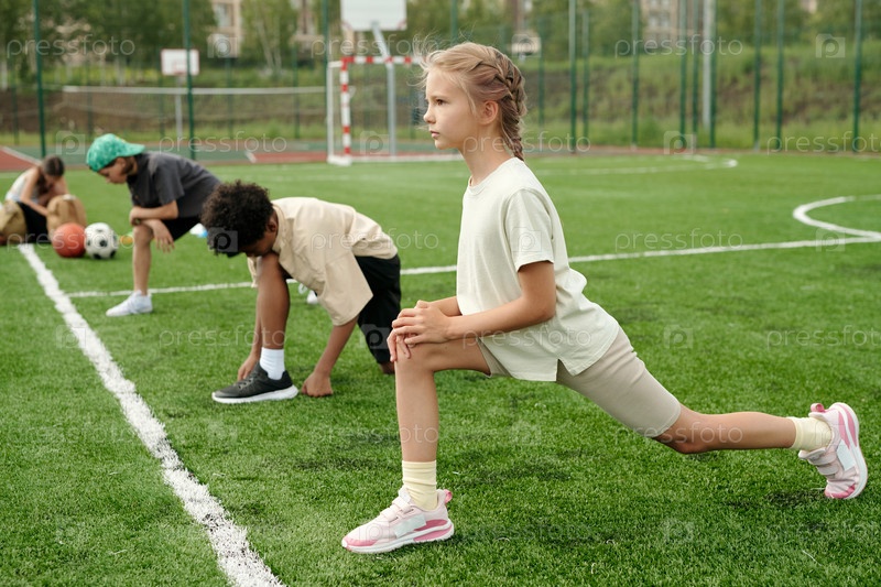 Боковой вид симпатичной блондинки-школьницы в спортивной одежде, делающей растяжные упражнения
