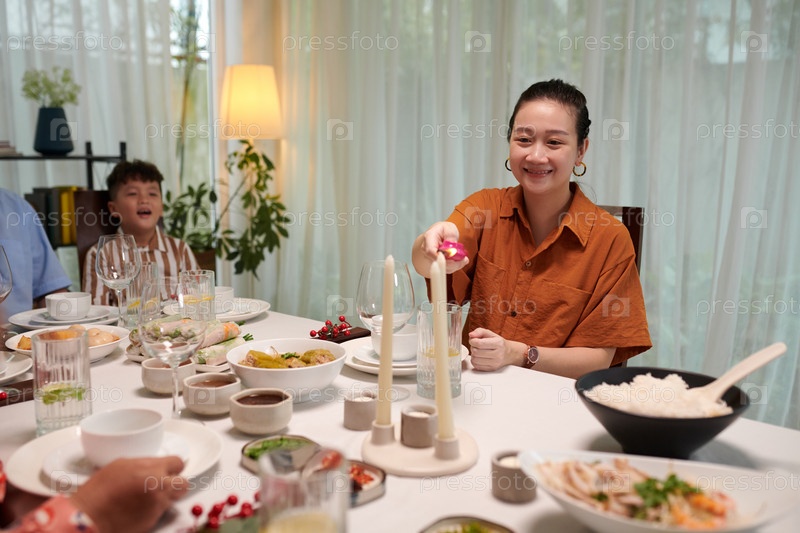 Женщина, зажигающая свечи за обеденным столом