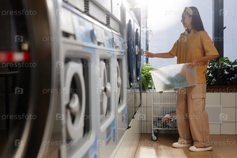 Боковой вид на красивую женщину, открывающую дверь автоматической стиральной машины