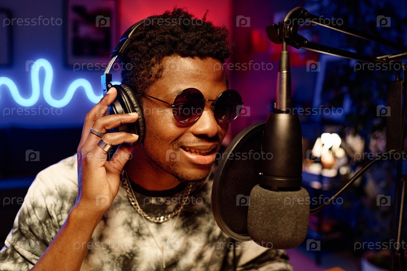 Молодой мужской ведущий в наушниках общается с онлайн-аудиторией