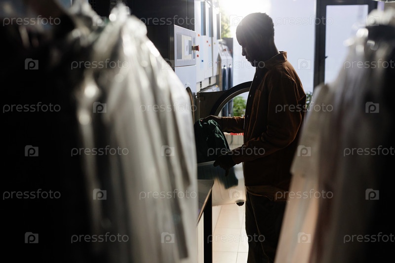Описание молодого человека с пластиковым контейнером, кладущего одежду в барабан
