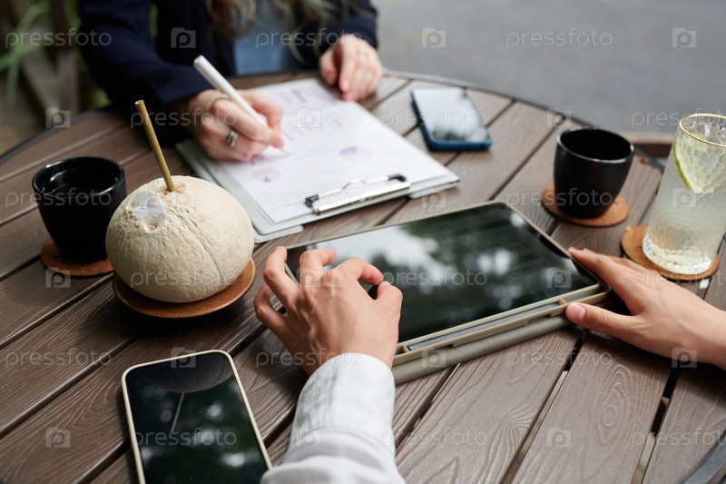 Бизнес-женщины, обсуждающие приложение финансовых услуг