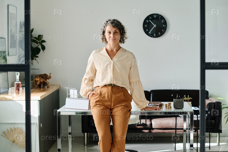 Серьезная зрелая деловая женщина в тихом роскошном наряде стоит у рабочего места