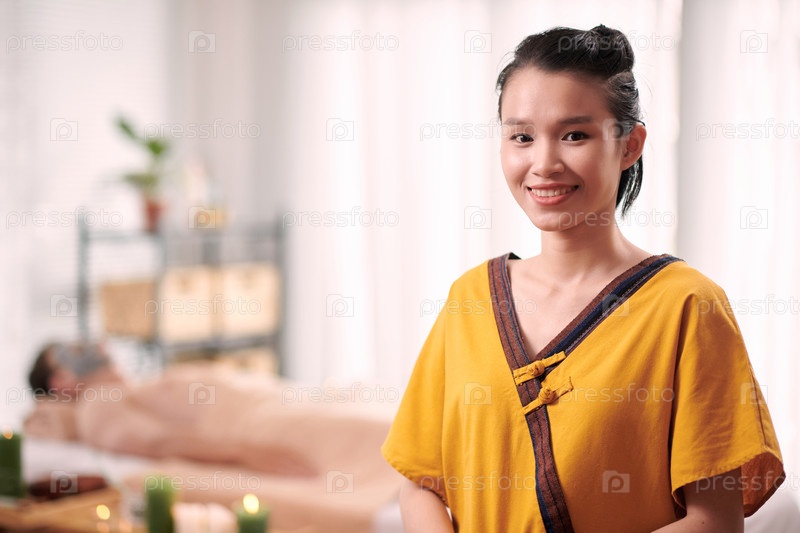 Молодая улыбающаяся азиатская косметолог и массажистка в униформе смотрят на тебя