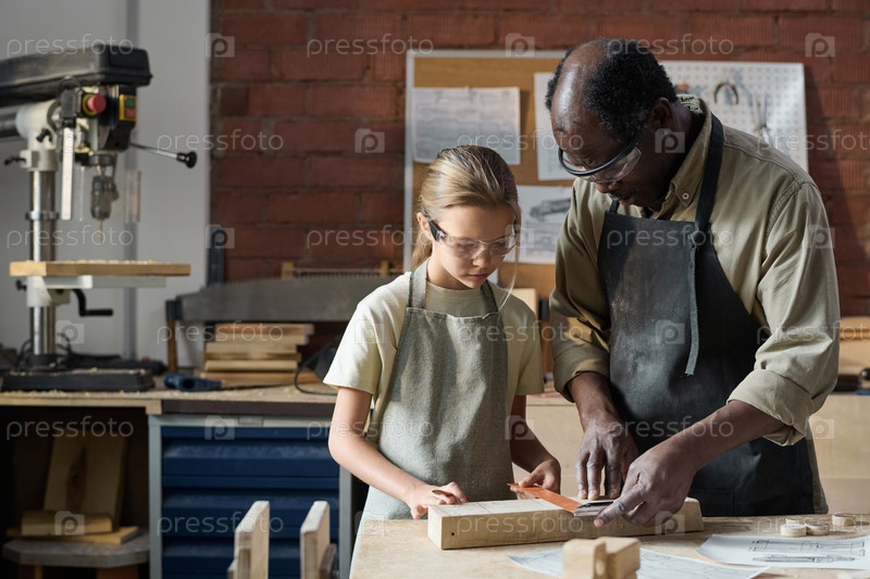 Девочка измеряет древесину в мастерской Студия с помощью старшего плотника