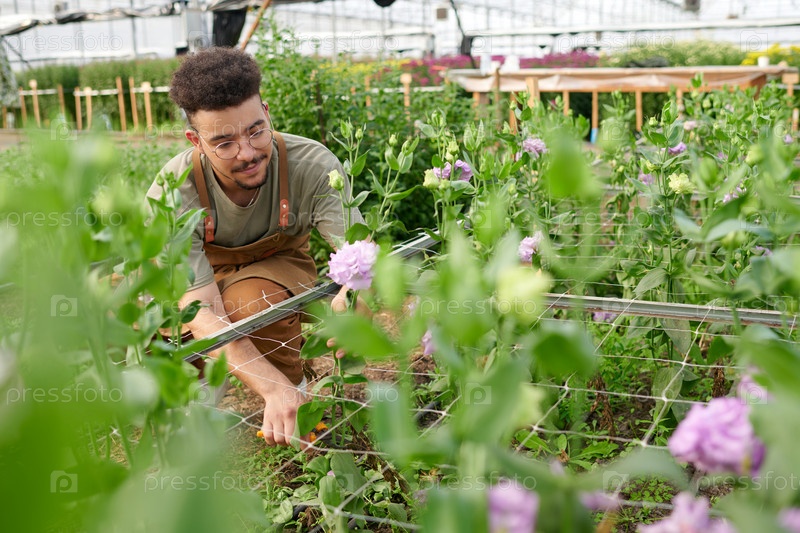 Молодой садовник-мужчина с клещами режет свежие фиолетовые цветы эустомы