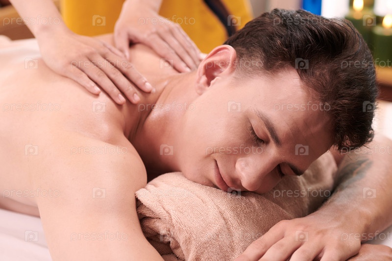 Молодой человек был доволен, лежа на диване и получая массаж спины и плеч