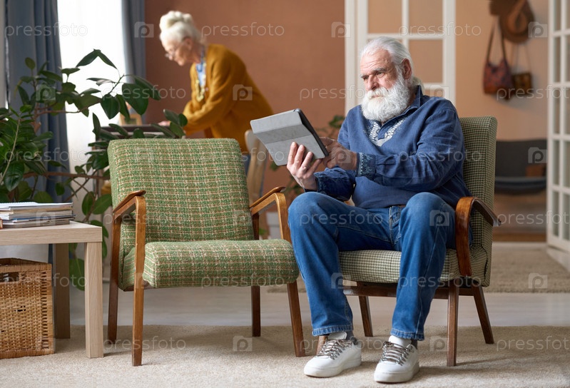 Старший мужчина, использующий планшетный компьютер дома