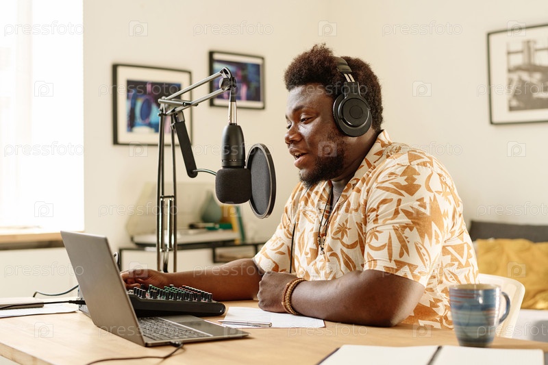 Молодой мужской вещатель регулирует звуки на саундборде во время речи