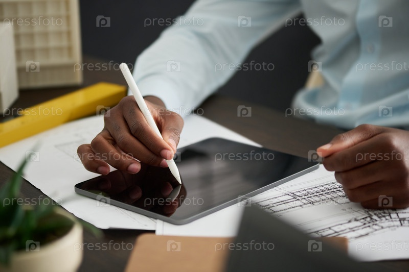 Фокус на руке молодого афроамериканского архитектора, рисующего эскиз нового здания