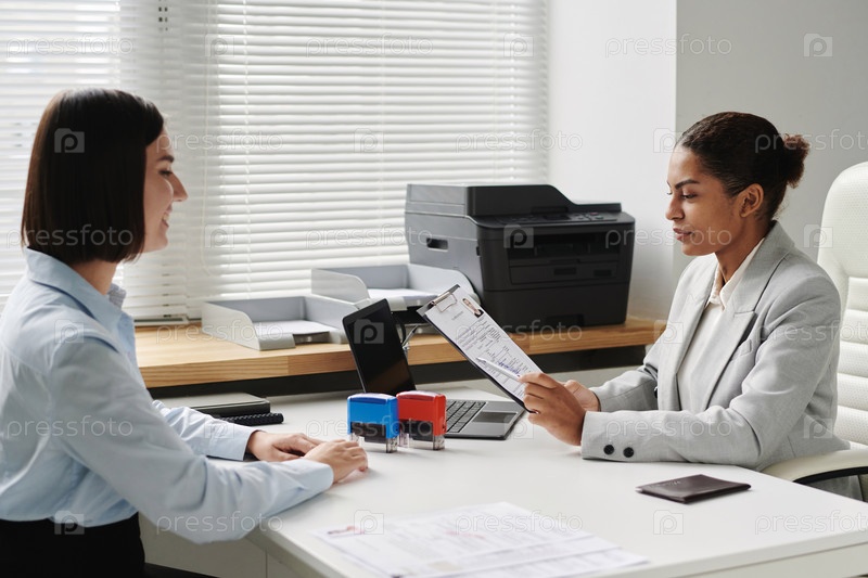 Женщина, проходящая собеседование со специалистом по визовому центру