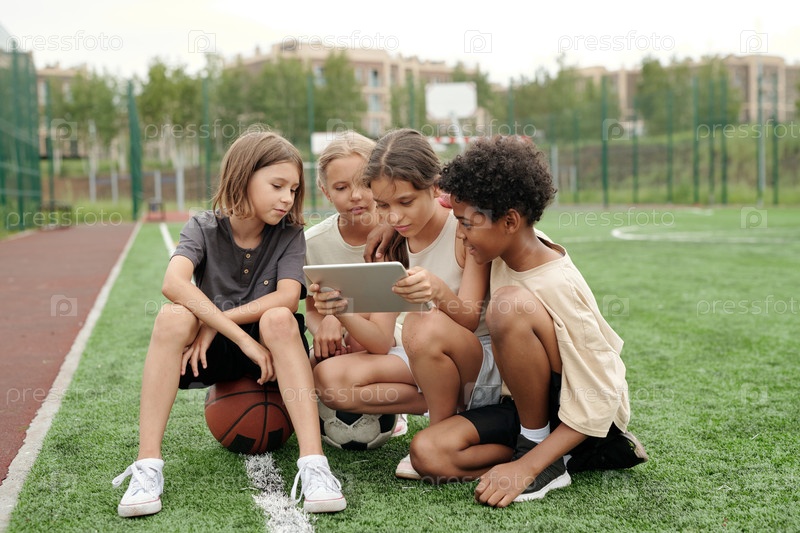 Несколько межкультурных школьников в спортивной одежде смотрят на экран планшета