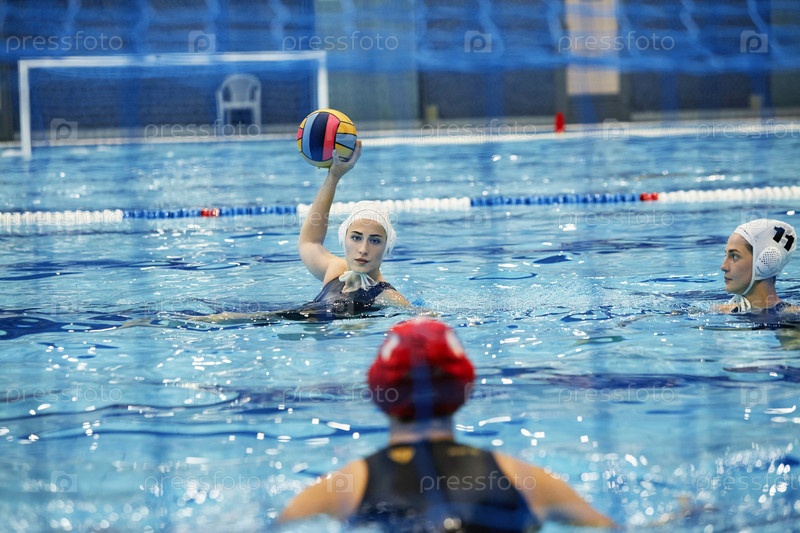 Молодая игрокка водяного поло с мячом, бросающим его в ворота соперничающей команды
