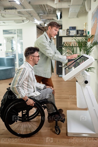 Человек с ограниченными возможностями, использующий компьютер в офисе
