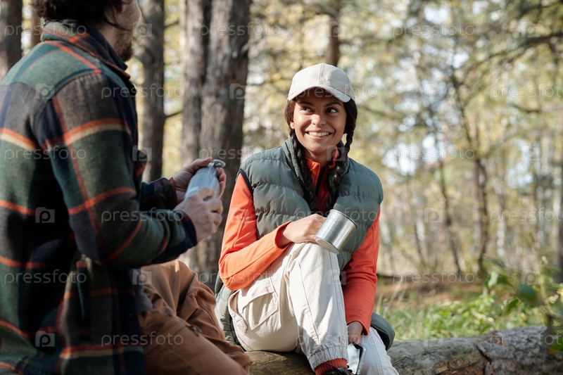 Молодая веселая афроамериканская женщина с кружкой, которая смотрит на своего мужа