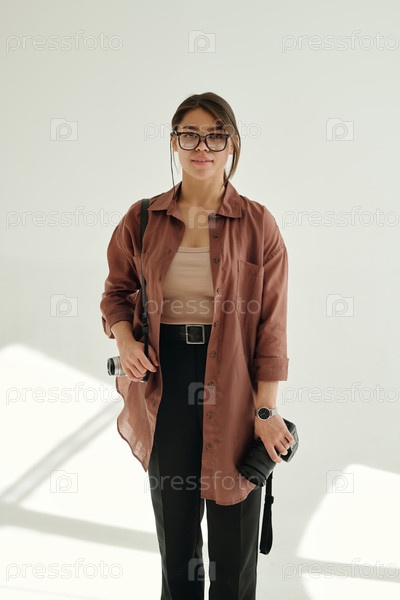 Молодая успешная женщина-модная фотограф в повседневной одежде, держащая фотоаппарат