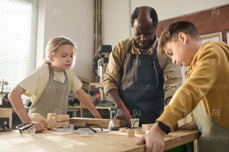 Старший плотник с двумя детьми строит деревянные игрушки вместе в мастерской