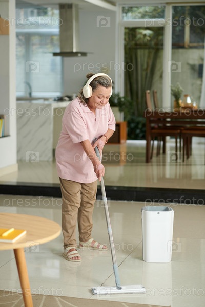 Пожилая женщина стирает пол в доме