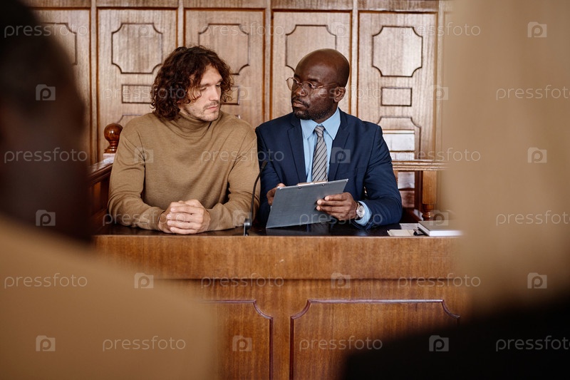 Молодой уверенный в себе мужчина-адвокат указывает на документ, объясняя информацию