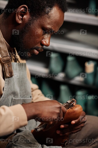 Боковой вид молодого афроамериканца в фартуке, создающего новую ботинку или обувь