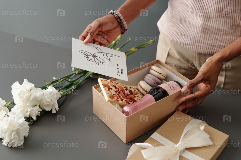Женщина кладет открытку в коробку с подарками