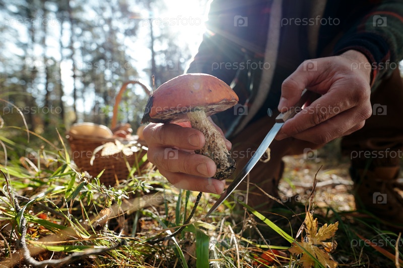 Руки молодого неузнаваемого мужчины с ножом, режущим гриб