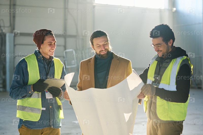 Счастливый молодой подрядчик и два сотрудника в защитных жилетах смотрят на эскиз