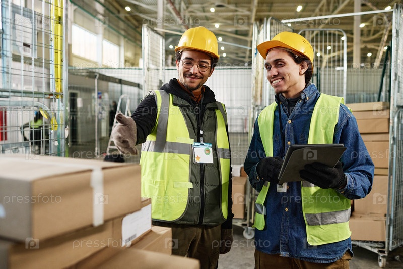 Счастливый молодой человек в рабочей одежде, использующий планшет и слушая коллегу