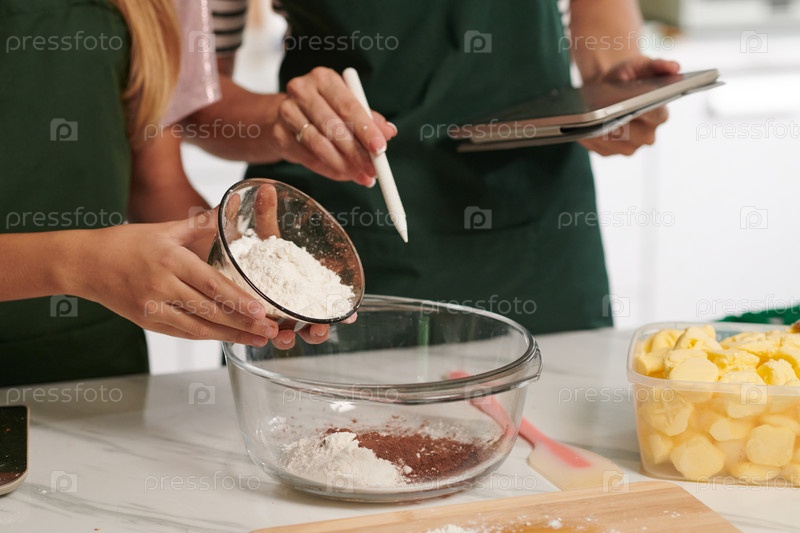Положить муку в миску при изготовлении теста