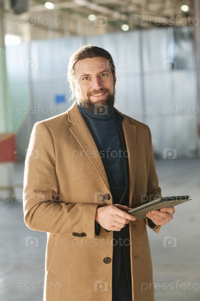 Молодой веселый предприниматель в бежевом пальто стоит перед камерой