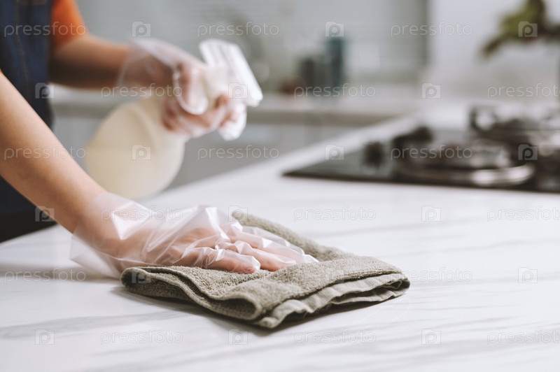 Клубовое изображение человека, стирающего кухонный столик хлопковым полотенцем