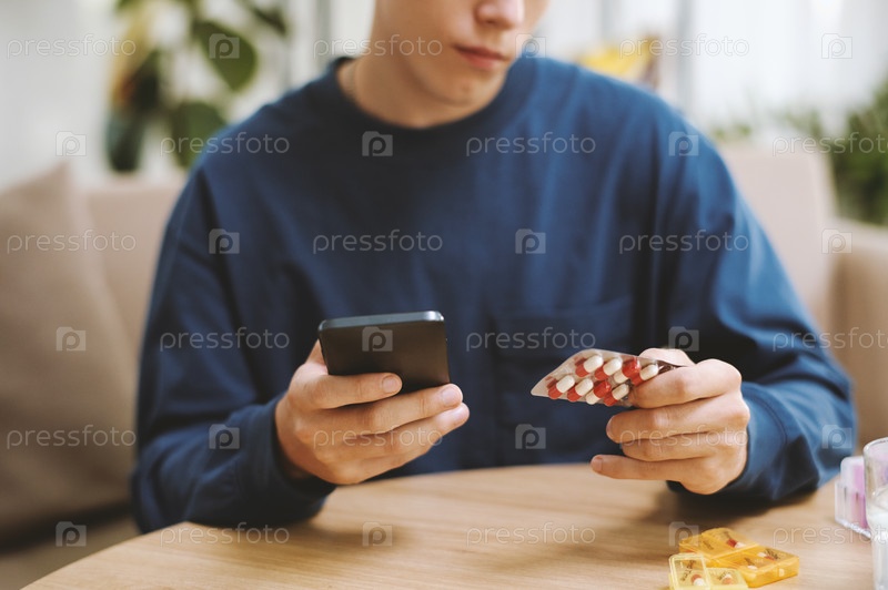 Молодой человек проверяет информацию о таблетках, прежде чем принимать лекарство