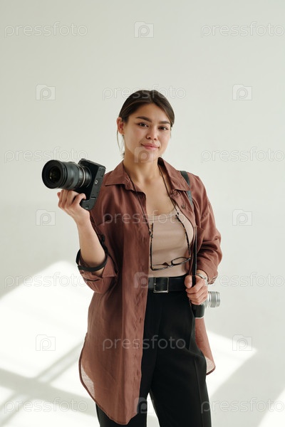 Молодая креативная женщина с профессиональной фотокамерой стоит в изоляции