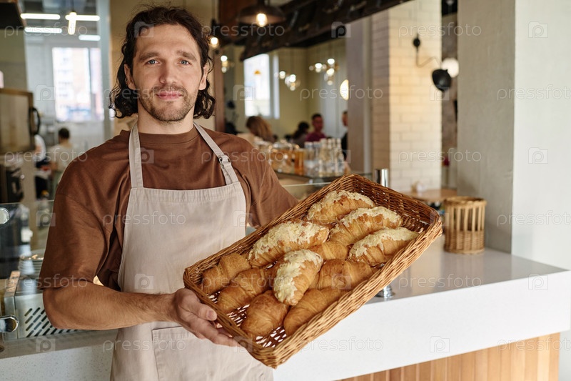 Работник кафе позирует на своем рабочем месте с выпечкой