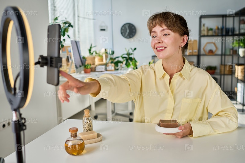 Счастливая молодая блогерша, нажимающая кнопку записи на экране смартфона