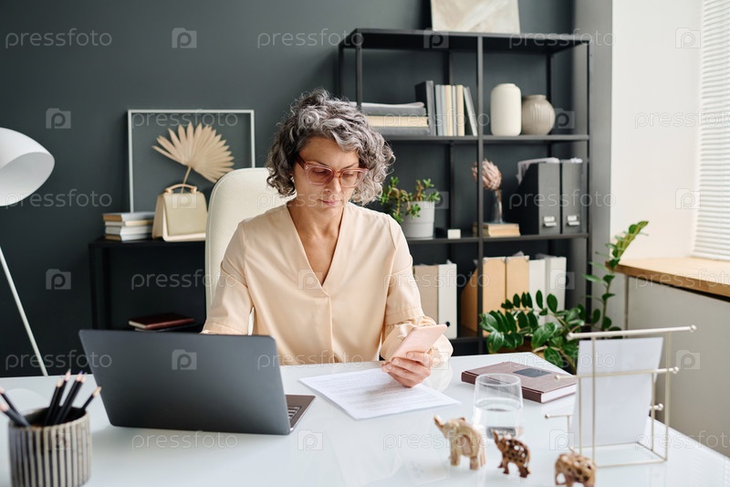 Серьезная деловая женщина, отправляющая сообщения или прокручивающая смартфон по месту работы