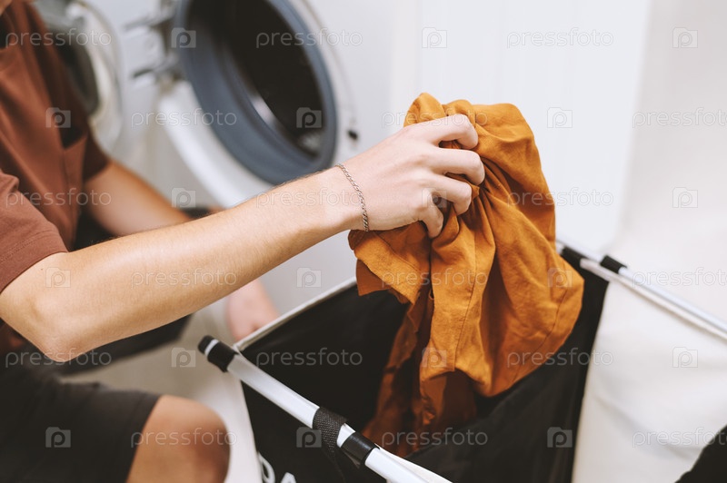 Молодой человек загружает стиральную машину с грязной одеждой