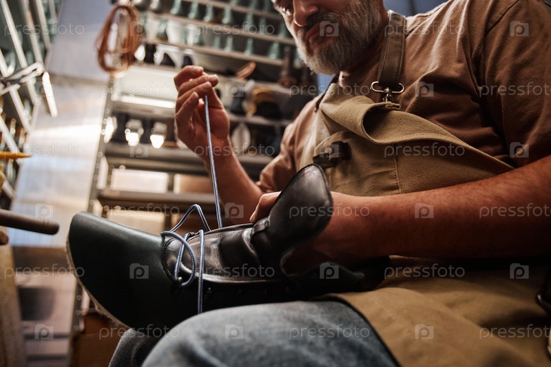 Близкий план опытного мастера обувного дела, который ставит шнурки в заготовку