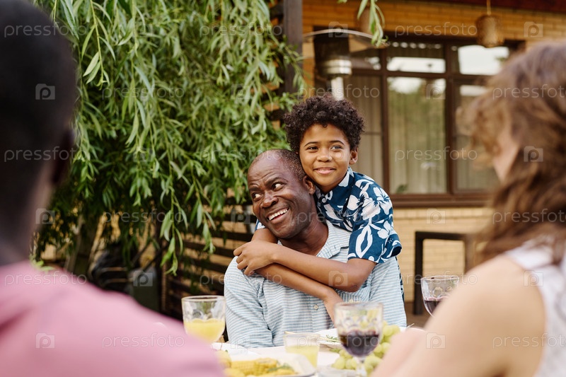 Милый мальчик обнимает своего счастливого дедушку и смотрит на мать