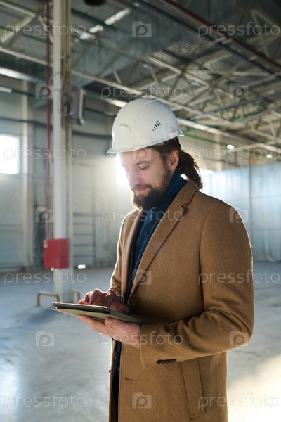 Молодой серьезный подрядчик просматривает онлайн-информацию на экране планшета