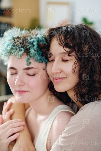 Счастливая молодая женщина с темно-волнистыми волосами обнимает свою девушку