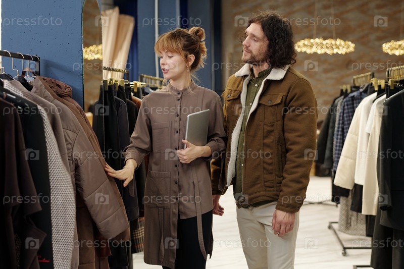 Молодой уверенный клерк с планшетом рекомендует клиенту теплое пальто