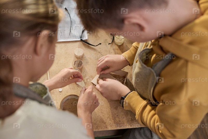 Top View Два ребенка строят деревянную модель вместе