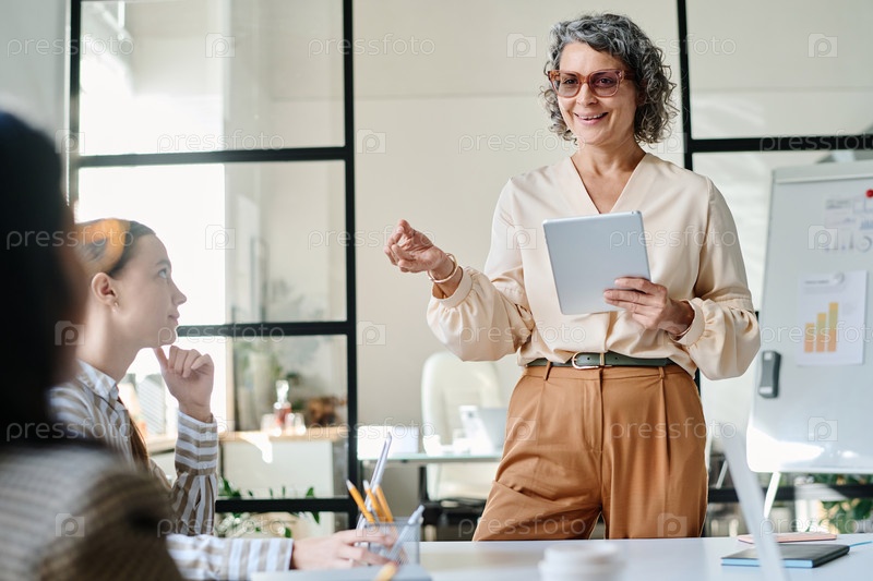 Счастливая уверенная в себе зрелая бизнесвумен с планшетом объясняет что-то