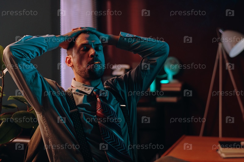 Молодой расслабленный мужчина с закрытыми глазами курит сигарету