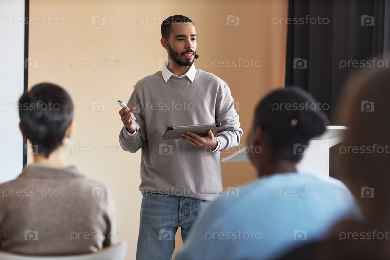 Молодой уверенный тренер с планшетом объясняет момент презентации